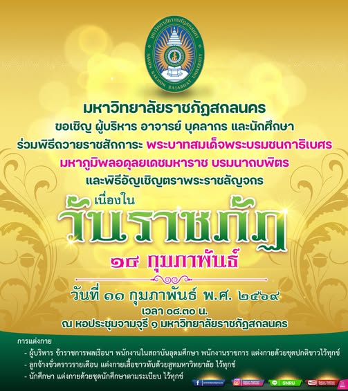มรสน. ขอเชิญผู้บริหาร อาจารย์ บุคลากร และนักศึกษา ร่วมพิธีถวายราชสักการะ พระบาทสมเด็จพระบรมชนกาธิเบศร มหาภูมิพลอดุลยเดชมหาราช บรมนาถบพิตร และ พิธีอัญเชิญตราพระราชลัญจกร เนื่องใน “วันราชภัฏ” 14 กุมภาพันธ์ เวลา 08.30 น. ในวันที่ 11 กุมภาพันธ์ 2569 ณ หอประชุมจามจุรี 1 มหาวิทยาลัยราชภัฏสกลนคร